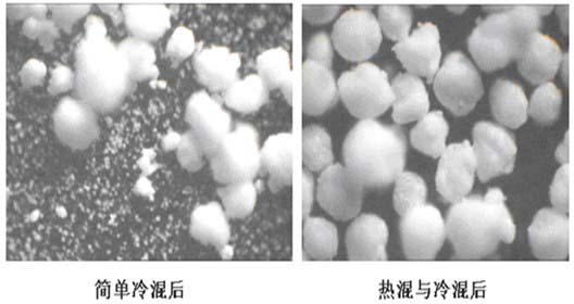 c)熱混與冷混溫度對混料效果的影響 熱混溫度需要高于PVC的玻璃化溫度。其具體設定值要根據(jù)熱混的目的是否達到來定。如果熱混溫度偏低,首先是干混料中小粒徑組份仍有很多,干混料易產(chǎn)生靜電,不利于流動,甚至在管道輸送過程中容易出現(xiàn)原料分層的現(xiàn)象,嚴重影響產(chǎn)品質(zhì)量;其次是干混料的預塑化程度不夠,不利于后期生產(chǎn)取得較好的塑化水平,產(chǎn)品的材料性能受影響;第三是原料中的水份等揮發(fā)份沒除盡,使后期加工中析出增加,產(chǎn)品易出現(xiàn)氣泡、甚至降解等現(xiàn)象,嚴重影響產(chǎn)品外觀和材料性能。如果熱混溫度設置太高,則干混料預塑化程度過高,穩(wěn)定劑在混料時即消耗太多,影響后期生產(chǎn)時的工藝控制和產(chǎn)品的材料與外觀性能,甚至影響產(chǎn)品的耐候性。公司冷混溫度設定在45~50℃。